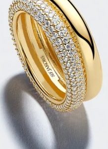 Anel em prata de lei 925, plaqueado a ouro 18k, superfície polida e cravejado com zircônias brancas lapidadas à mão.