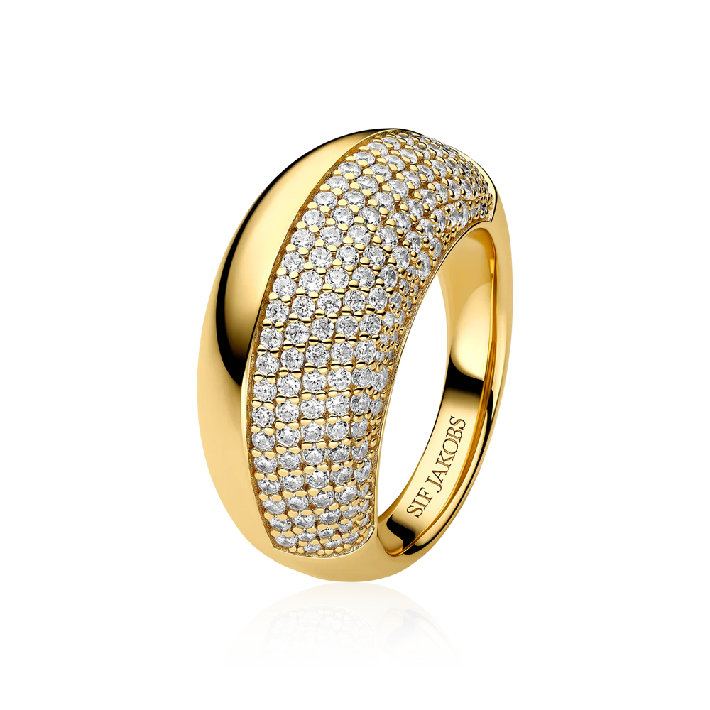 Anel em prata de lei 925, plaqueado a ouro 18k, superfície polida e cravejado com zircônias brancas lapidadas.