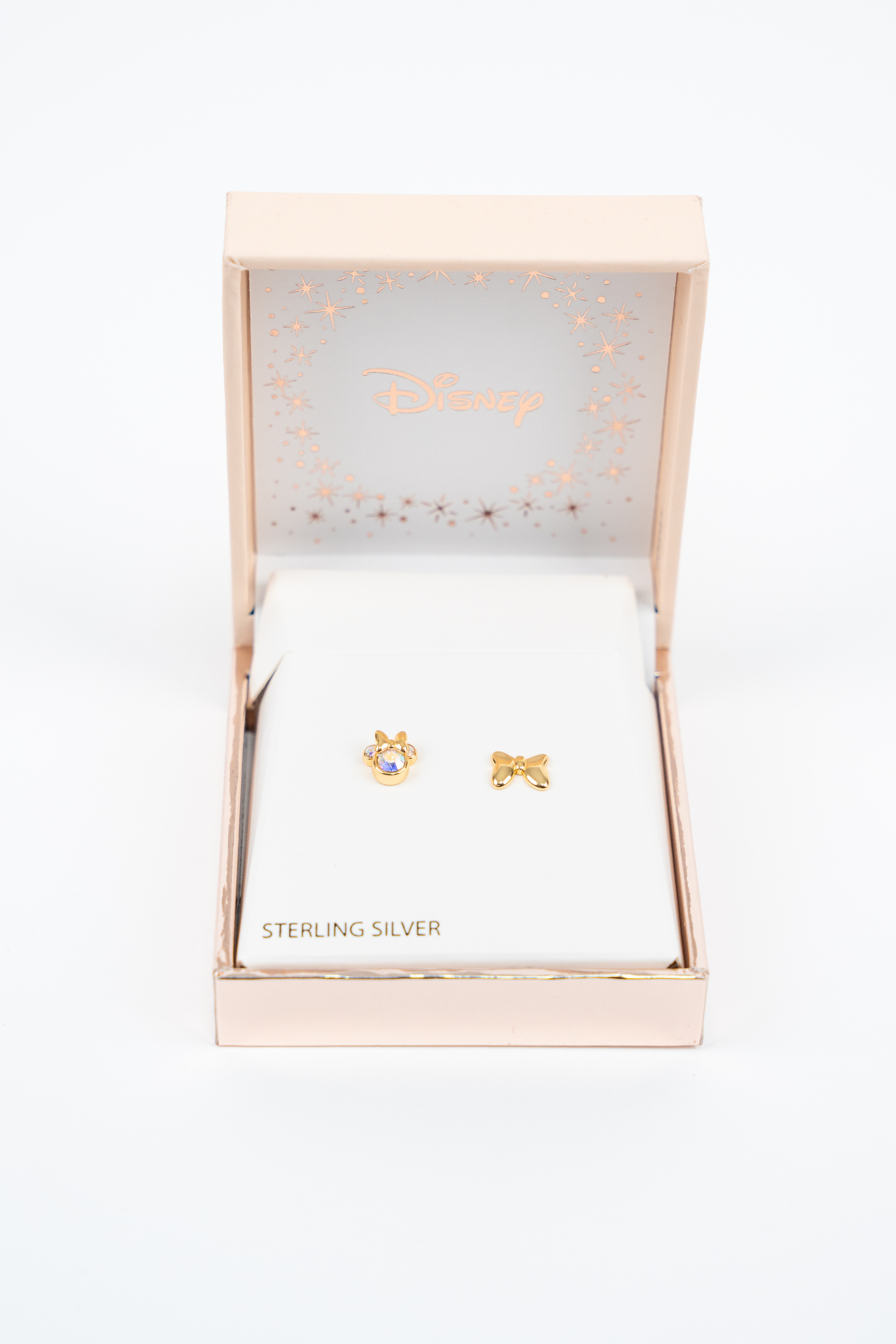 Brincos Disney – Minnie Mouse dourado com zirconias – Laço Dourado e Minnie.