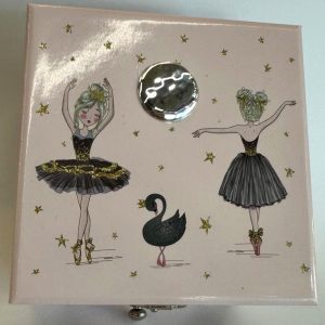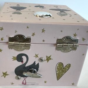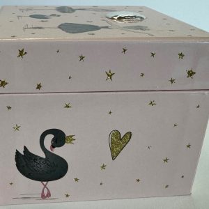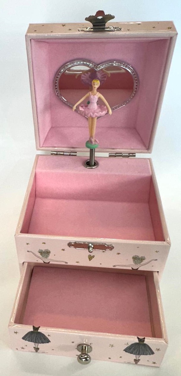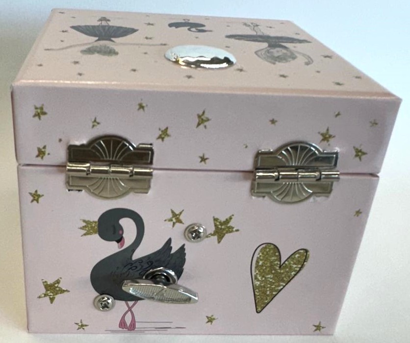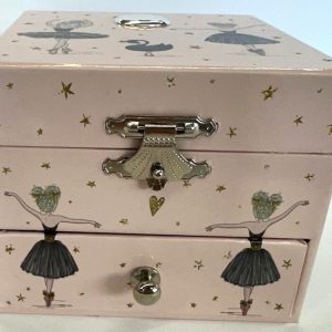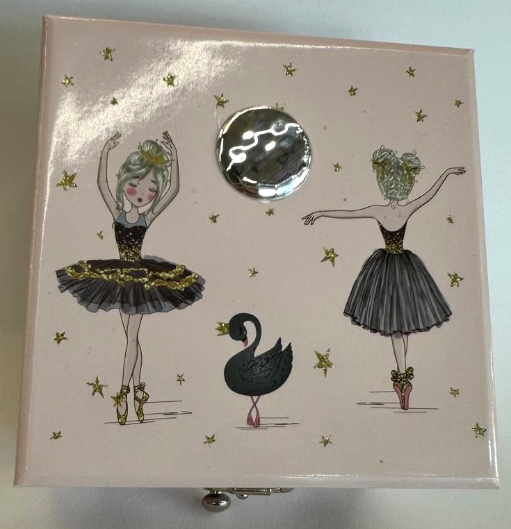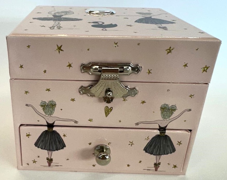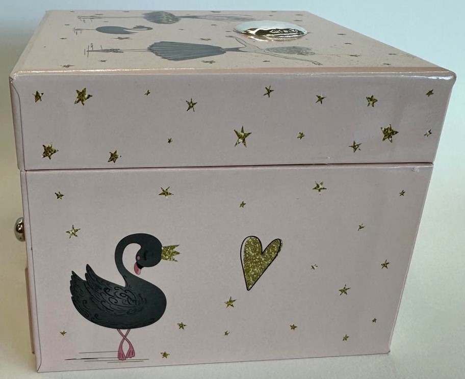 É uma caixa de música elegante em tom rosa suave, decorada com delicados detalhes de bailarinas, estrelas douradas e cisnes. Para abrir, tem um fecho metálico clássico, revelando na abertura uma encantadora bailarina que gira ao som de uma melodia suave, acionada por um mecanismo tradicional de dar à corda. Inclui ainda uma prática gaveta inferior, ideal para guardar pequenos objetos como joias ou lembranças especiais.