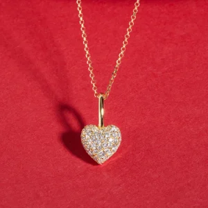 Colar dourado com pingente em prata de lei 925, plaqueado a ouro 18k, com superfície polida e cravejado com zircônias brancas lapidadas.